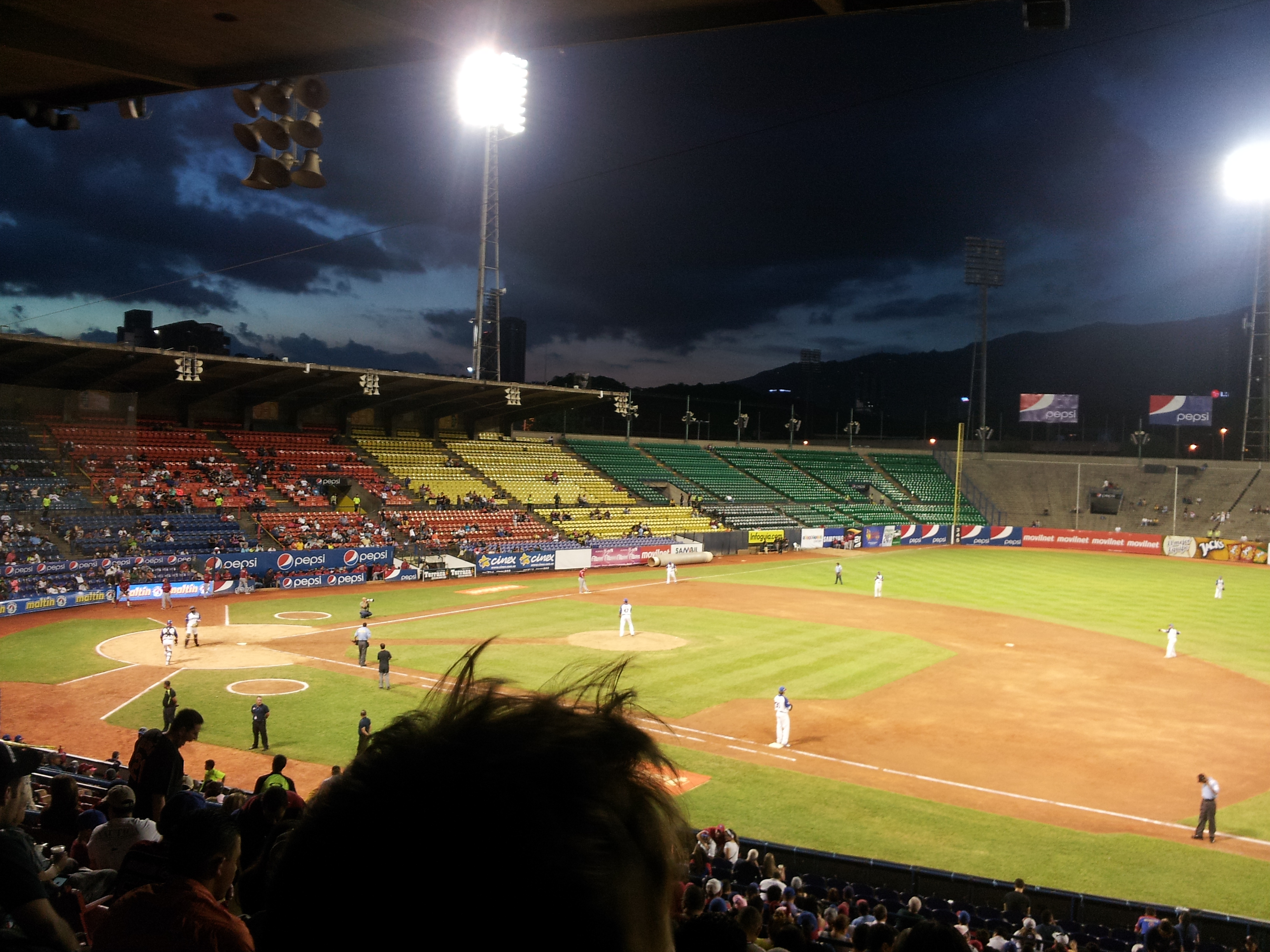Mostly empty, mostly colorful seats.